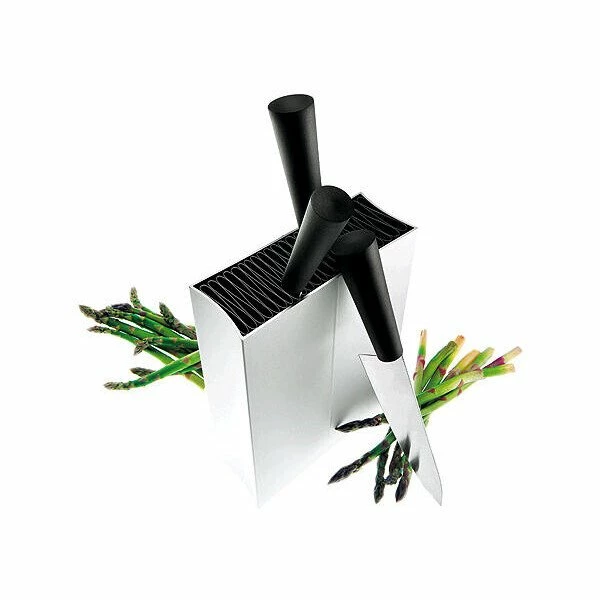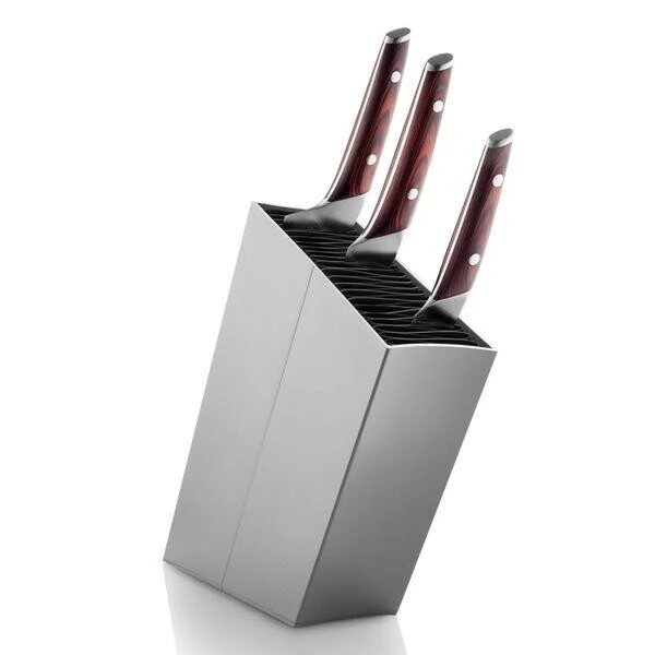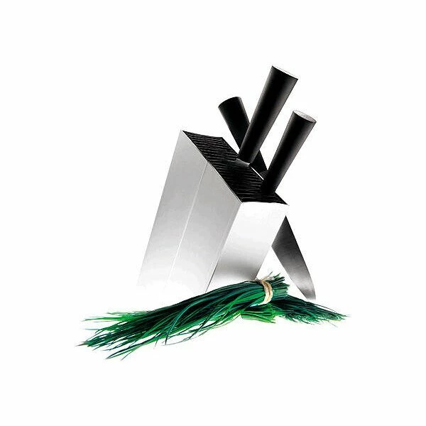 Der Mehrzweck-Messerblock mit Aluminium-Gehäuse hält Messer und andere Küchenhelfer in praktischer Griffnähe. Der Kunststoff-Einsatz kann zur Reinigung entnommen werden.
