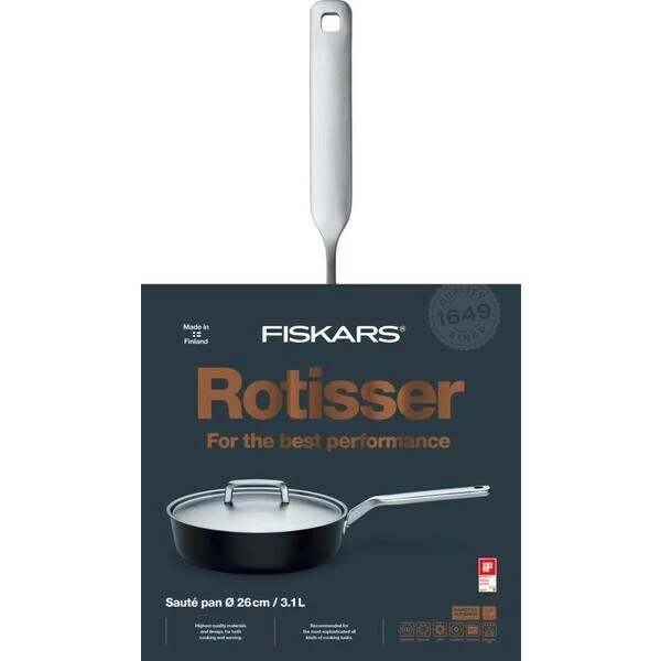 Scharfes Anbraten leicht gemacht: Mit der Sautierpfanne aus der Serie Rotisser von Fiskars gelingt das zügige Anbraten von Fleisch, ohne lästige Fettspritzer. Der hohe Seitenrand und der dicht schließende Deckel schützen Sie und die Oberflächen Ihrer Küche vor heißem Fett.