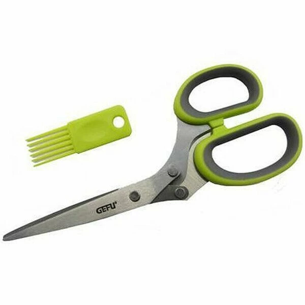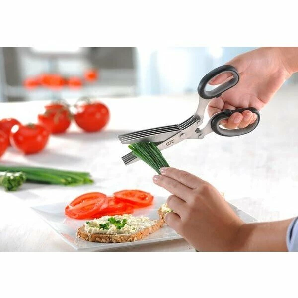 Die Kräuterschere von Gefu wartet mit einer 5-fach-Klinge auf und kann somit mit einem Schnitt schnell und unkompliziert Schnittlauch, Petersilie, aber auch Rosmarin und Salbeiblätter zerkleinern. Ein praktischer Küchenhelfer, um Lieblingsgerichte immer frisch und stets aromatisch zu verfeinern.
