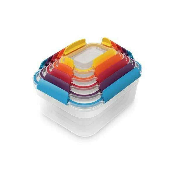 Das praktische Vorratsdosen-Set der Serie Nest Lock von Joseph Joseph besticht durch seine transparenten Deckel und Böden, die den Blick in das Innere der Dose gewähren. Gleichzeitig lassen sich die 5 Aufbewahrungsdosen trotz ihrer unterschiedlichen Größen platzsparend stapeln und sind mit ihren bunten Deckeln im stressigen Küchenalltag ganz leicht zu finden.