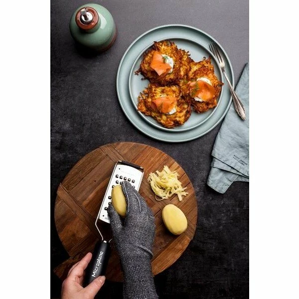 Um beim Reiben von Gemüse, Käse und Co. besonders vorsichtig zu sein, eignet sich der praktische Schutzhandschuh von Microplane. Für einen sicheren Umgang mit den rasiermesserscharfen Klingen der Reiben von Microplane.