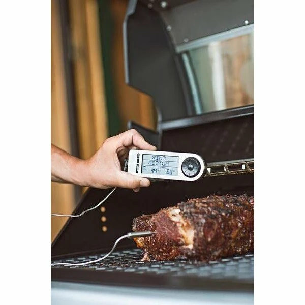 Das digitale Bratenthermometer von Rösle bestimmt die perfekte Kerntemperatur von Fleisch mit einem Messfühler aus Metall.