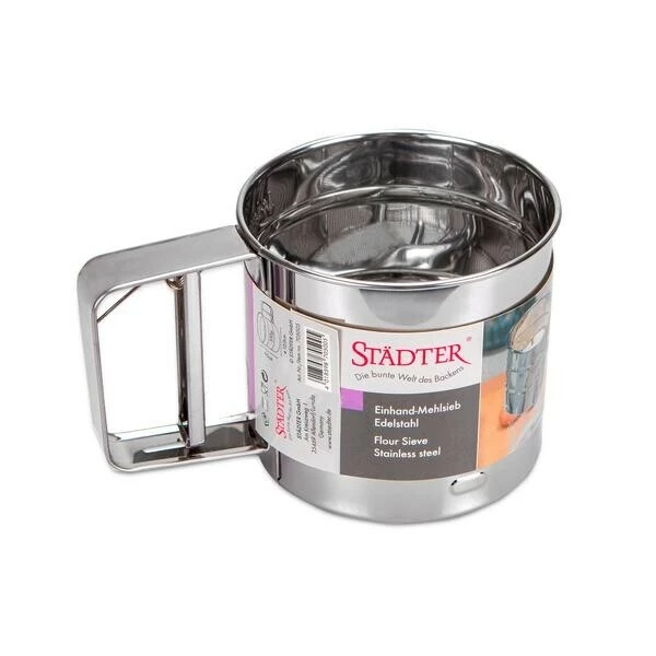 Mit dem Einhand-Mehlsieb von Städter dosieren Sie Mehl punktgenau und fein zerstäubt locker aus dem Handgelenk heraus. Der praktische Küchenhelfer lässt sich mit nur einer Hand bedienen, damit Sie die andere Hand zum Halten von Schüsseln frei haben.