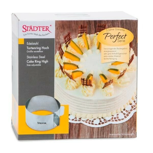 Mit dem hohen Tortenring von Städter gelingen selbst mehrstöckige Torten und cremige Verführungen mühelos. Einfach den glänzenden Ring zum Backen und zum Befüllen um die Torte legen, schon wird Ihr Back- und Zierprozess von Erfolg gekrönt sein.