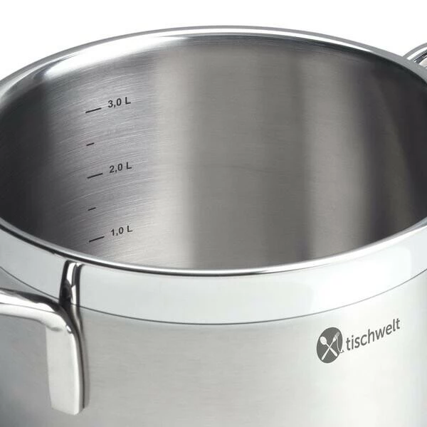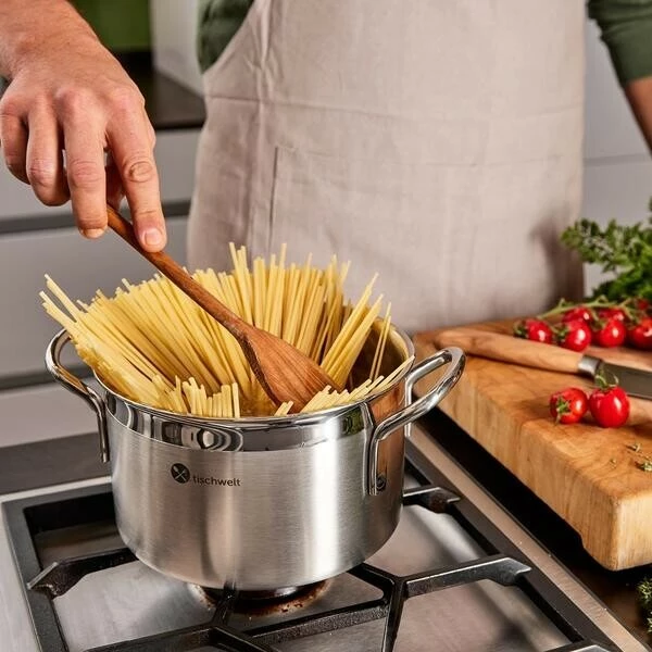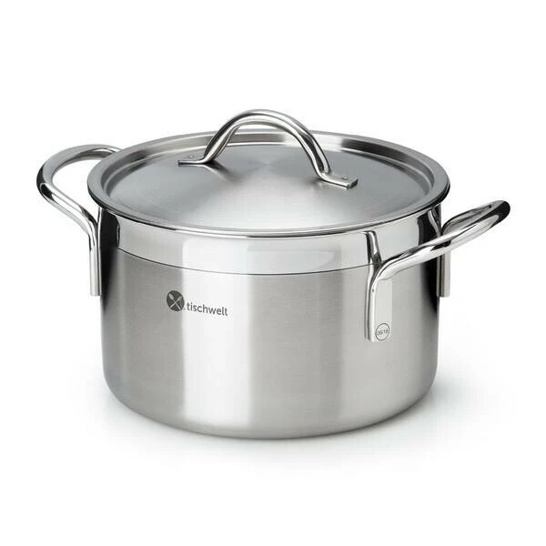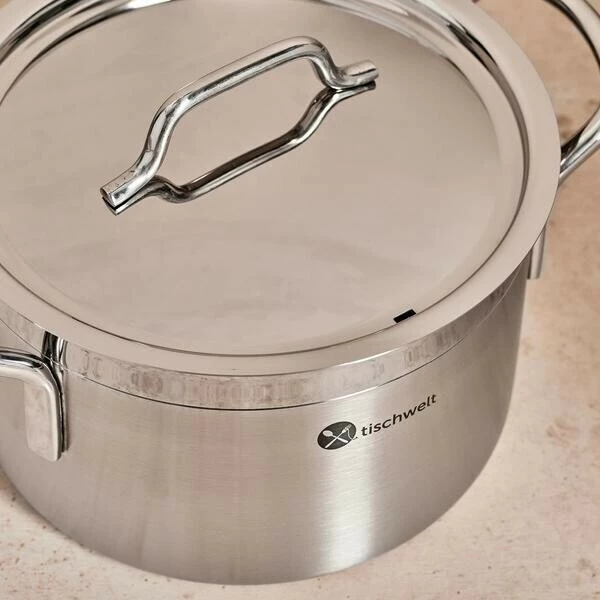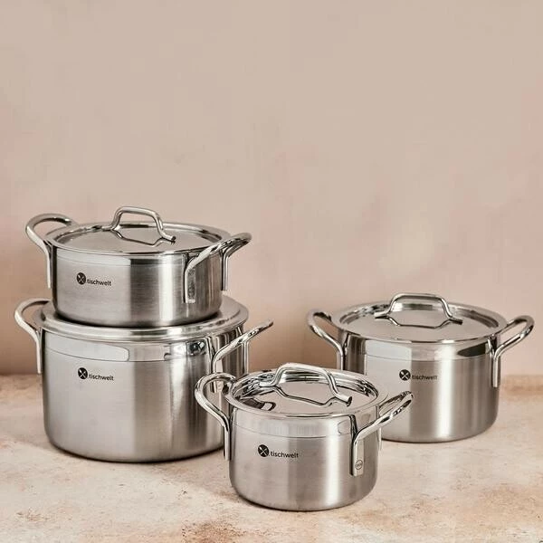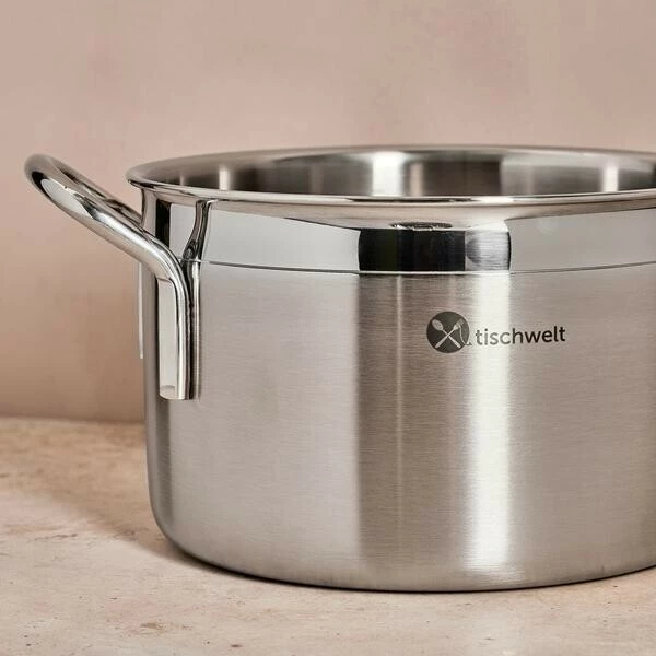 Das energieeffiziente Topf-Set Cook Love von tischwelt begeistert auf ganzer Linie. Die Töpfe punkten als hervorragende Wärmeleiter, die mit einem fünflagigen Mehrschichtmaterial dafür sorgen, dass sich die Hitze vom Boden aus gleichmäßig bis über den Rand verteilt. So werden Ihre Speisen von allen Seiten homogen und schonend erwärmt. Perfekt für ein zügiges Kochen, das gleichzeitig Energie spart und saftige, geschmackvolle Ergebnisse liefert.