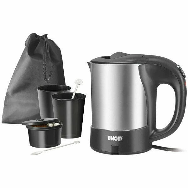 Im Lieferumfang dieses praktischen Reisebegleiters sind enthalten: Ein Reise-Blitzkocher aus Edelstahl für 0,5 Liter Wasser. Ausserdem 2 Tassen,2 Löffel, 1 unterteilbarer Vorratsbehälter, der zum Beispiel für Milchpulver und Zucker oder Gewürze und Brühepulver Verwendung finden kann. Das Zubehör passt genau in den Wasserkocher und Diesen können Sie einfach in dem, ebenfalls beiliegenden, Aufbewahrungsbeutel transportieren.
