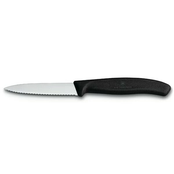 Mit dem Gemüsemesser Swiss Classic von Victorinox bereiten Sie im Nu leckere Gerichte zu. Das pfiffige Messer huscht mit seinem scharfen Wellenschliff flink durch straffe Tomatenhäute und kräftige Kartoffeln, lässt sich aber auch von zarten Bananenstücken oder sehnigen Fleischstücken nicht irritieren.