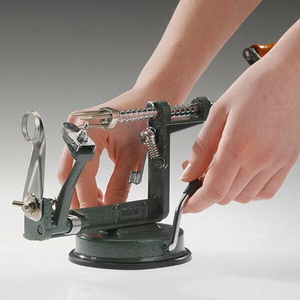 Der Apfelschäler Apfeltraum aus dem Hause Westmark ist ein Multitalent mit drei Funktionen. Er schält, entkernt und schneidet Äpfel in nur einem Arbeitsgang. Der Apfelschäler ist mit einem Saugfuß ausgestattet, so dass ein rutschfreies und sicheres Arbeiten gewährleistet ist. Die Entkern- und Schälelemente können individuell eingesetzt werden. Besonders Kinder lieben die Apfelspiralen. Mit dem Apfelschäler lassen sich auch Spiralen aus Kartoffeln herstellen. Im Lieferumfang ist eine bebilderte Anleitung mit Rezeptvorschlägen enthalten.